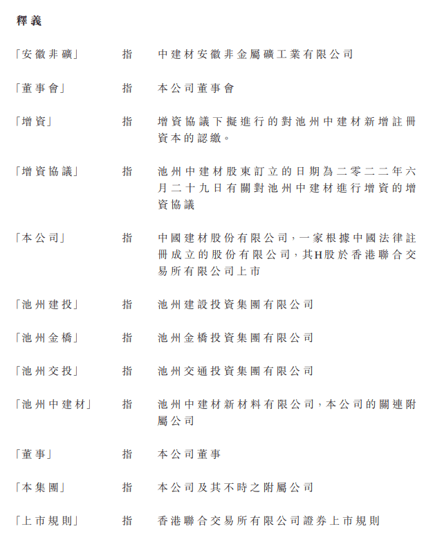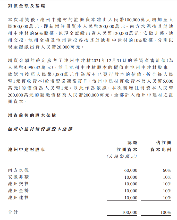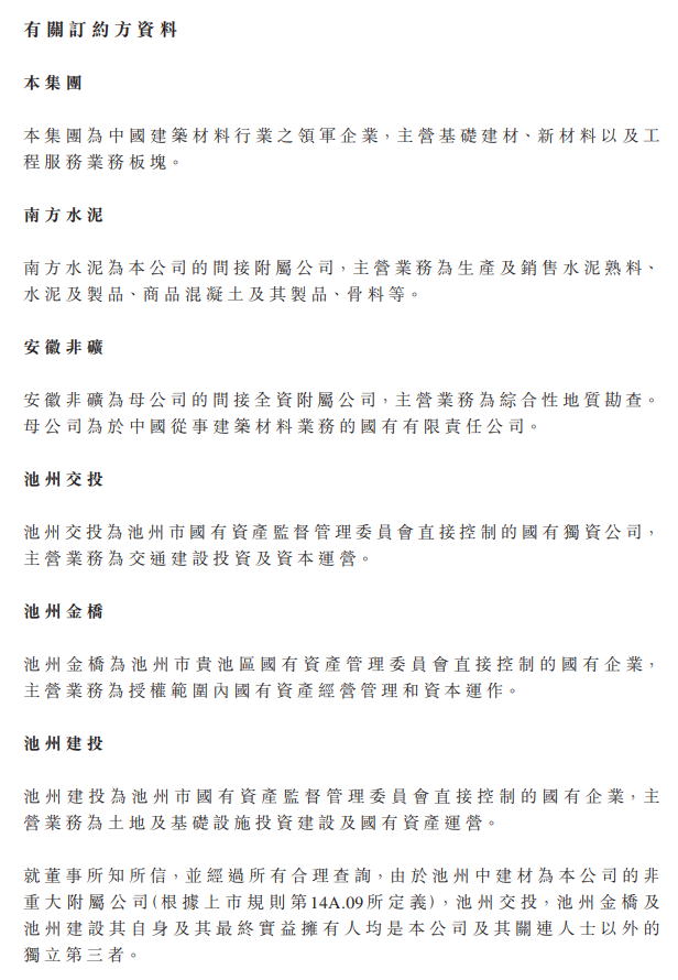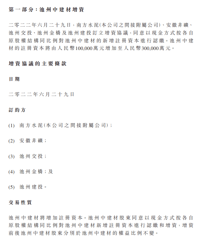 據悉,池州中建材為該公司的關聯附屬公司,主營業務為生產及銷售新型建筑材料及制品、復合材料及制品、建筑石料、土砂石、骨料等。本次增資基于項目建設需要,旨在增強池州中建材的資金實力和運營能力,符合公司經營發展及全體股東的利益。