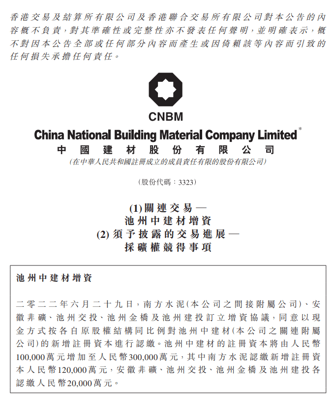 中國建材(03323)公布,于2022年6月29日,南方水泥(該公司的間接附屬公司)、安徽非礦、池州交投、池州金橋及池州建投訂立增資協議,同意以現金方式按各自原股權結構同比例對池州中建材的新增注冊資本進行認繳。池州中建材的注冊資本將由人民幣10億元增加至人民幣30億元,其中南方水泥認繳新增注冊資本人民幣12億元,安徽非礦、池州交投、池州金橋及池州建投各認繳人民幣2億元。