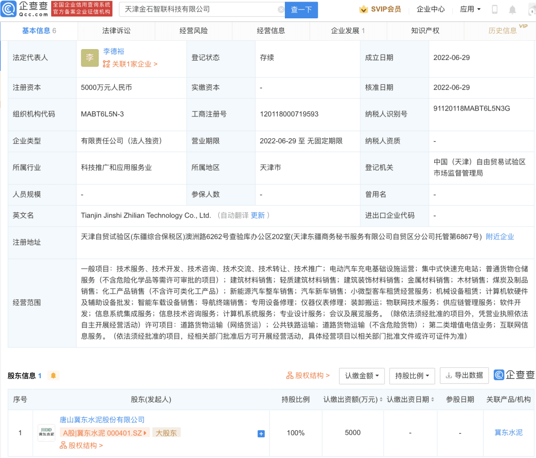 天眼查APP顯示,6月29日,天津金石智聯科技有限公司成立,法定代表人為李德裕,注冊資本5000萬元,經營范圍包含:電動汽車充電基礎設施運營;集中式快速充電站;新能源汽車整車銷售;汽車新車銷售;小微型客車租賃經營服務等。企查查股權穿透顯示,該公司由冀東水泥100%控股。