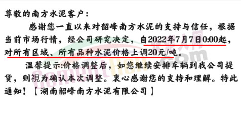 水泥人網(wǎng)通訊員消息:日前湖南區(qū)域多家企業(yè)通知上調(diào)水泥價(jià)格20元/噸。其中湖南韶峰南方水泥有限公司通知自7月7日0時(shí)起,對所有區(qū)域、所有品種水泥價(jià)格上調(diào)20元/噸。