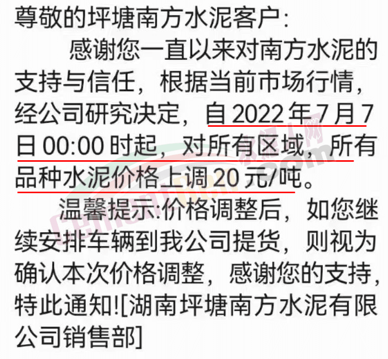 坪塘南方水泥通知,根據(jù)當(dāng)前市場行情,自7月7日0時(shí)起,對所有區(qū)域,所有品種水泥價(jià)格上調(diào)20元/噸。