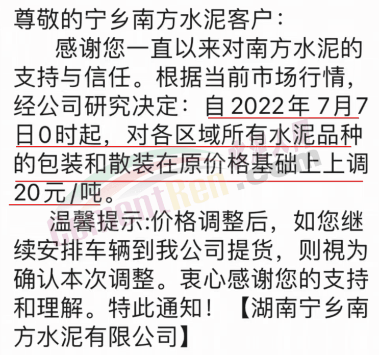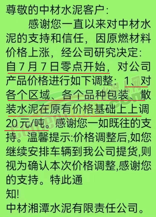中材湘潭水泥有限責(zé)任公司通知,因原燃材料價(jià)格上漲,經(jīng)公司研究決定自7月7日零點(diǎn)開始,對各區(qū)域、各品牌包裝、散裝水泥在原價(jià)基礎(chǔ)上上調(diào)20元/噸。