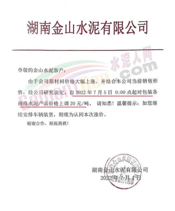 湖南金山水泥通知,由于公司原材料價(jià)格大幅上漲,結(jié)合公司當(dāng)前銷售形勢,經(jīng)公司研究決定,自7月5日0時(shí)起對包裝各規(guī)格水泥產(chǎn)品價(jià)格上調(diào)20元/噸。