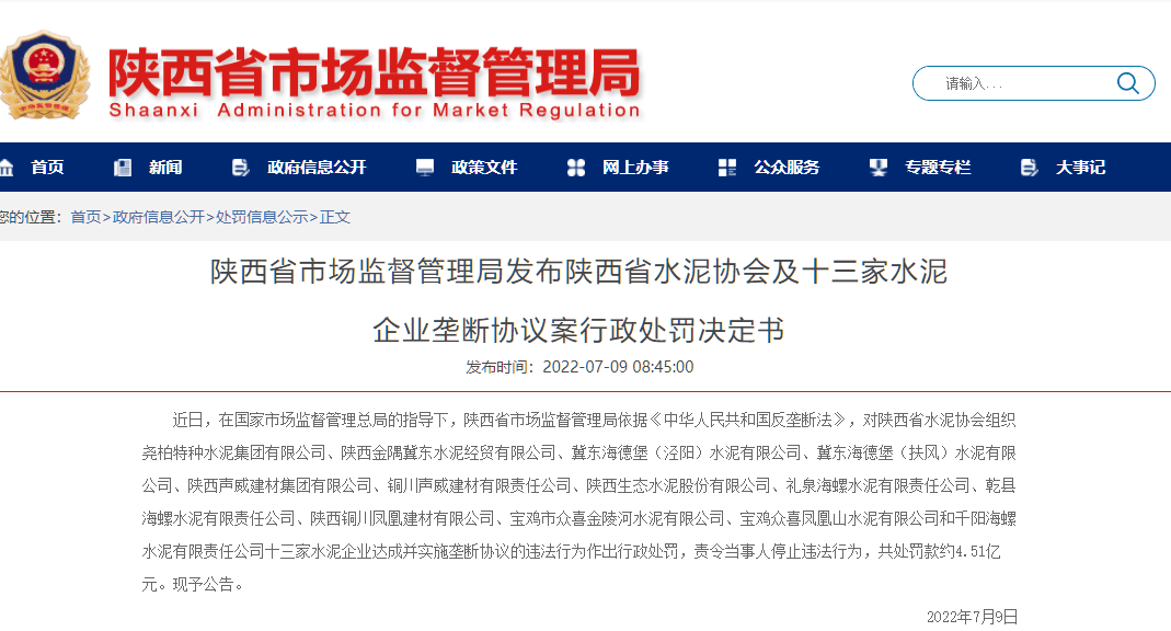 日前,市場監管總局發布陜西省水泥協會組織13家水泥企業達成并實施壟斷協議案行政處罰決定書稱,陜西省市場監督管理局于2019年7月對陜西省水泥協會組織13家水泥企業涉嫌達成并實施壟斷協議行為立案調查。2022年6月28日,陜西省市場監督管理局依法對本案當事人作出行政處罰決定?,F予公告。