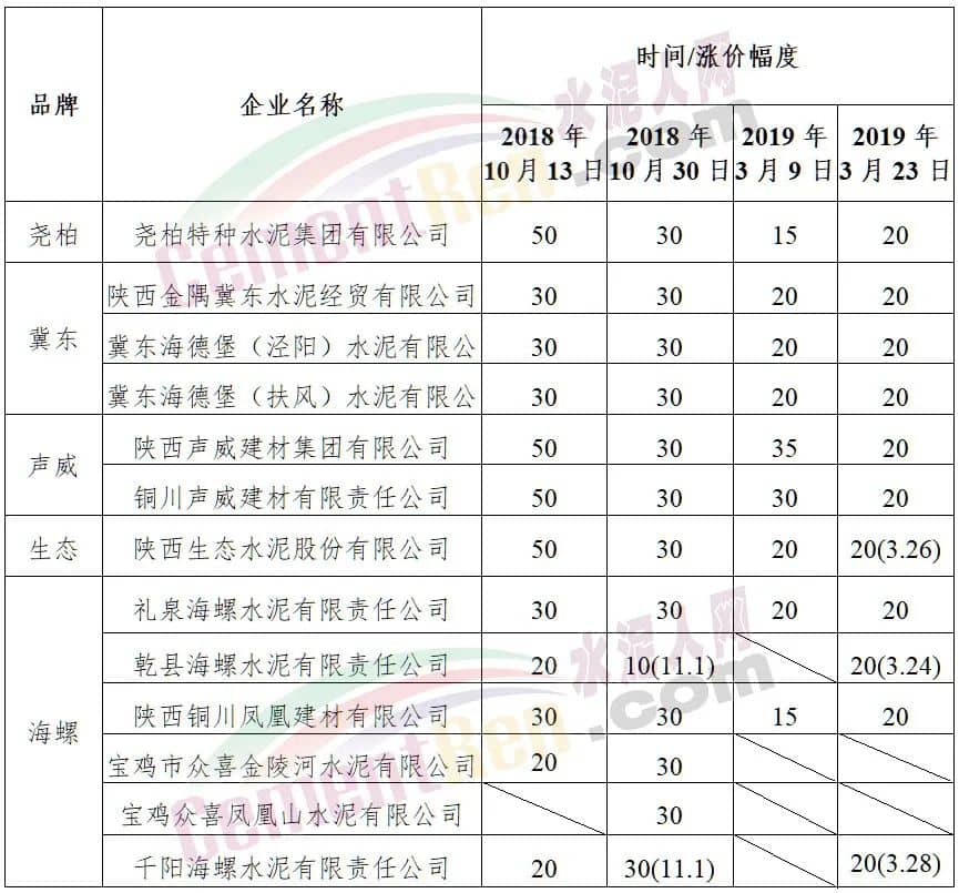2019年3月22日,生態(tài)水泥有關(guān)負(fù)責(zé)人召集,陜西省水泥協(xié)會有關(guān)負(fù)責(zé)人、堯柏水泥有關(guān)負(fù)責(zé)人、冀東水泥有關(guān)負(fù)責(zé)人、聲威水泥有關(guān)負(fù)責(zé)人、海螺水泥有關(guān)負(fù)責(zé)人、生態(tài)水泥有關(guān)負(fù)責(zé)人在西安市鳳城八路附近茶秀商談價(jià)格上調(diào)事宜,并達(dá)成以下共識:從3月23日起各品種水泥上調(diào)20元/噸。