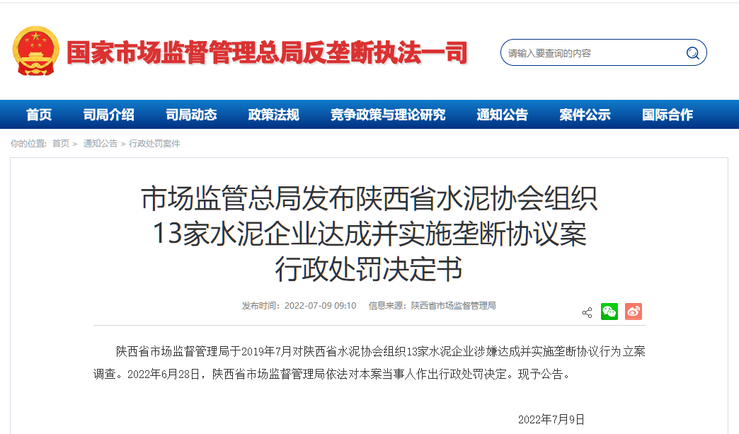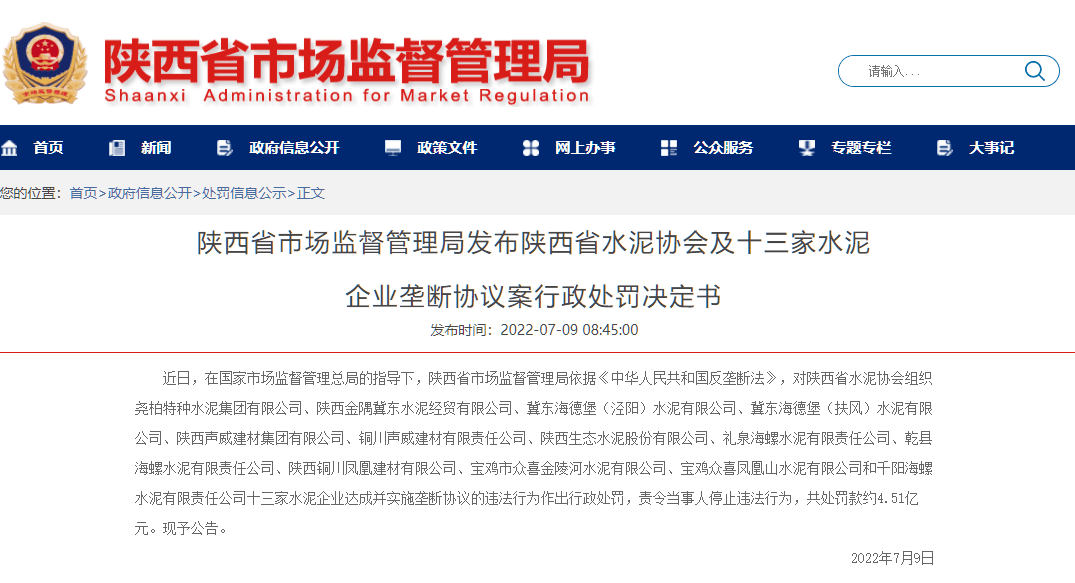 陜西省市場監(jiān)督管理局發(fā)布《陜西省水泥協(xié)會及十三家水泥企業(yè)壟斷協(xié)議案行政處罰決定書》稱,近日,在國家市場監(jiān)督管理總局的指導(dǎo)下,陜西省市場監(jiān)督管理局依據(jù)《中華人民共和國反壟斷法》,對十三家水泥企業(yè)達(dá)成并實(shí)施壟斷協(xié)議的違法行為作出行政處罰,責(zé)令當(dāng)事人停止違法行為,共處罰款約4.51億元。
