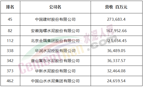 財富Plus APP于北京時間7月12日發布2022年《財富》中國500強排行榜,考量了全球范圍內最大的中國上市企業在過去一年的業績和成就。水泥行業,中國建材、海螺水泥、金隅冀東、華潤水泥、冀東水泥、華新水泥、山水水泥等7家水泥企業上榜。