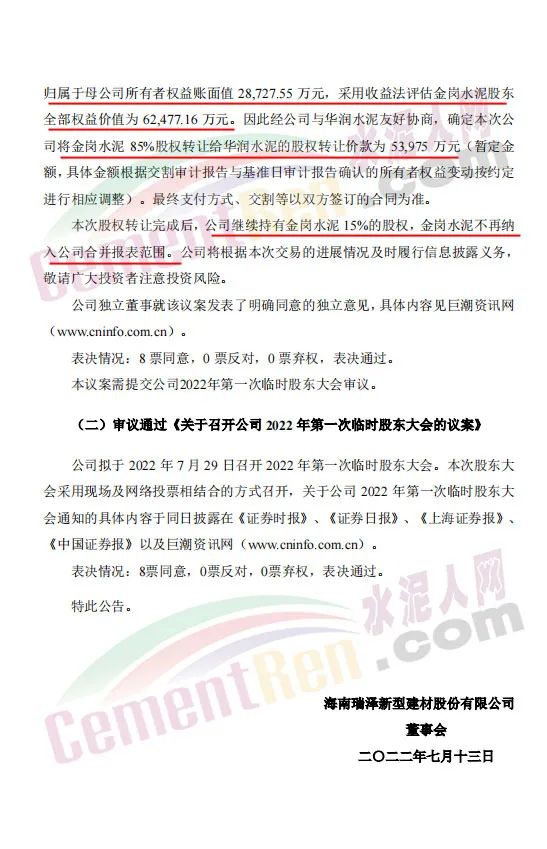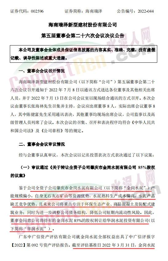 7月13日,海南瑞澤發布公告,鑒于公司全資子公司肇慶市金崗水泥有限公司(以下簡稱“金崗水泥”)產能規模偏小,自身無石灰石礦山等資源優勢,水泥熟料生產成本偏高,水泥產品缺乏競爭優勢,且未來公司將重點專注于環保生態產業、商品混凝土及裝配式建筑業務;同時為進一步調整公司債務結構,降低公司短期內流動性風險。因此,董事會同意公司將持有的金崗水泥85%的股權轉讓給華潤水泥投資有限公司。