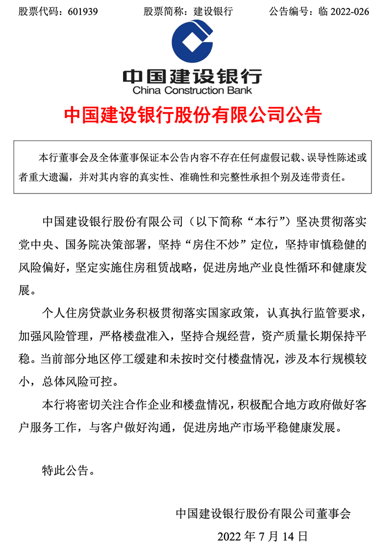 建設銀行公告稱,該行堅決貫徹落實黨中央、國務院決策部署,堅持“房住不炒”定位,堅持審慎穩健的風險偏好,堅定實施住房租賃戰略,促進房地產業良性循環和健康發展。