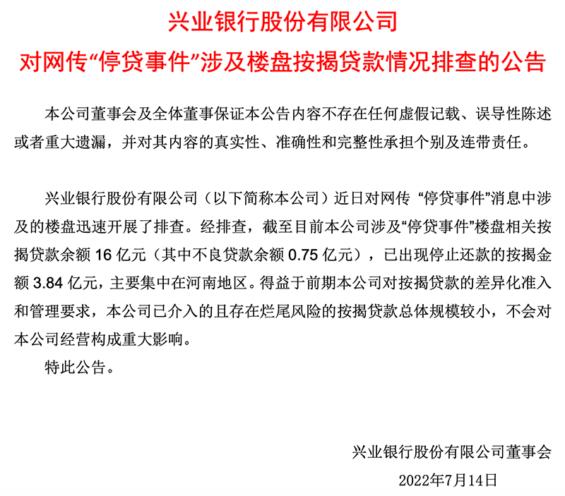 興業銀行發布公告稱,近日對網傳“停貸事件”消息中涉及的樓盤迅速開展了排查。經排查,截至目前,該行涉及“停貸事件”樓盤相關按揭貸款余額16億元(其中不良貸款余額0.75億元),已出現停止還款的按揭金額3.84億元,主要集中在河南地區。