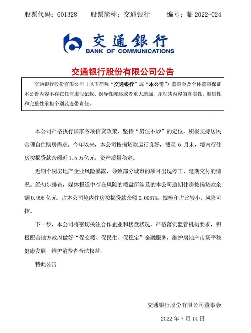 交通銀行稱,近期個別房地產企業風險暴露,導致部分城市的項目出現停工、延期交付的情況。經初步排查,媒體報道中存在風險的樓盤所涉及該行逾期住房按揭貸款余額0.998億元,占本公司境內住房按揭貸款余額0.0067%,規模和占比較小,風險可控。