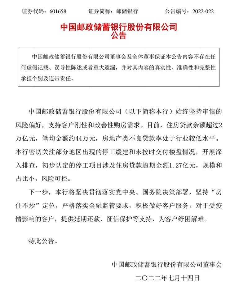 郵儲銀行:初步認定停工項目涉及住房貸款逾期金額1.27億元