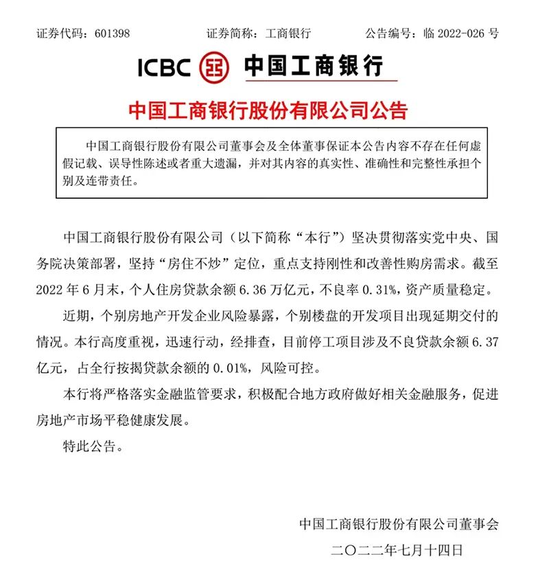 工商銀行公告稱,該行堅決貫徹落實黨中央、國務院決策部署,堅持“房住不炒”定位,重點支持剛性和改善性購房需求。截至2022年6月末,個人住房貸款余額6.36萬億元,不良率0.31%,資產質量穩定。