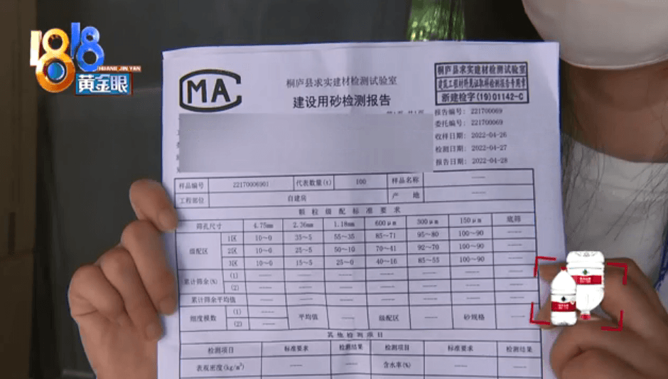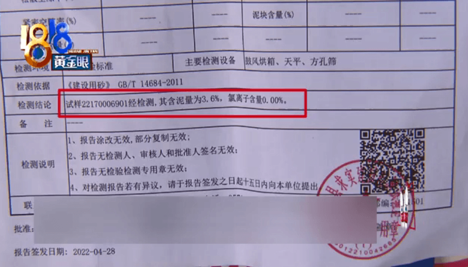 在建設用砂檢測報告中結論是“試樣經檢測,其含泥量為3.6,氯離子含量0%”。雖未明確是否合格,檢測機構工作人員表示,“她只讓做了這兩個數據,這兩個數據是符合要求的。”