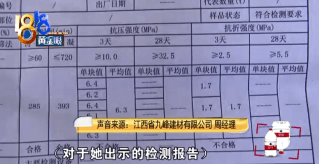 針對記者提出的關于檢測結果的問題,周經理表示:這批次水泥已經檢查過了,是合格的。對于唐女士出示的檢測報告,他表示不認可。