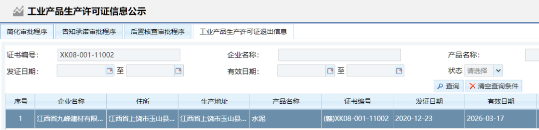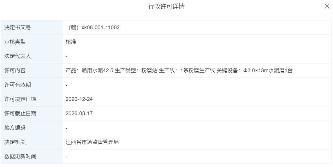 經查詢企業生產許可證編號(贛)XK08-001-11002,企業類型為粉磨站,擁有一條粉磨生產線,關鍵設備為Φ3.0×13m水泥磨1臺。