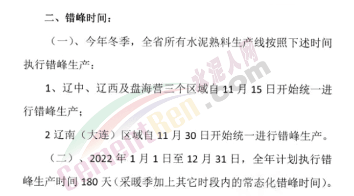 據水泥人網此前報道,早在去年12月遼寧省建筑材料工業協會水泥分會就發布了《遼寧省水泥行業2021年冬季和2022年錯峰生產方案》要求:2022年1月1日至12月31日,全年計劃執行錯峰生產時間180天。