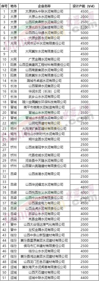 據(jù)山西省工信廳公布的熟料生產(chǎn)線清單顯示,山西省內(nèi)包括中聯(lián)水泥、金隅冀東、山水水泥、金圓水泥旗下企業(yè)在內(nèi)的熟料生產(chǎn)線共51條。