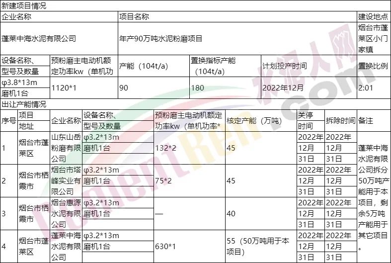 年產(chǎn)100萬噸水泥粉磨項目產(chǎn)能置換情況