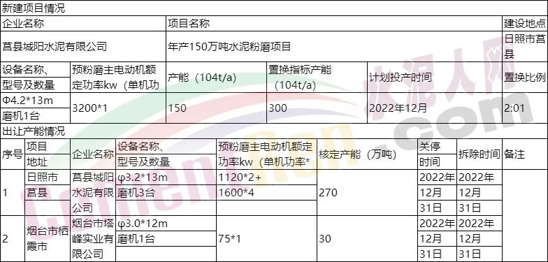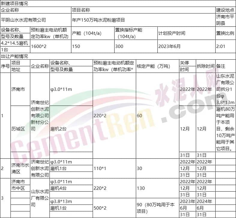 年產(chǎn)150萬噸水泥粉磨項目產(chǎn)能置換情況