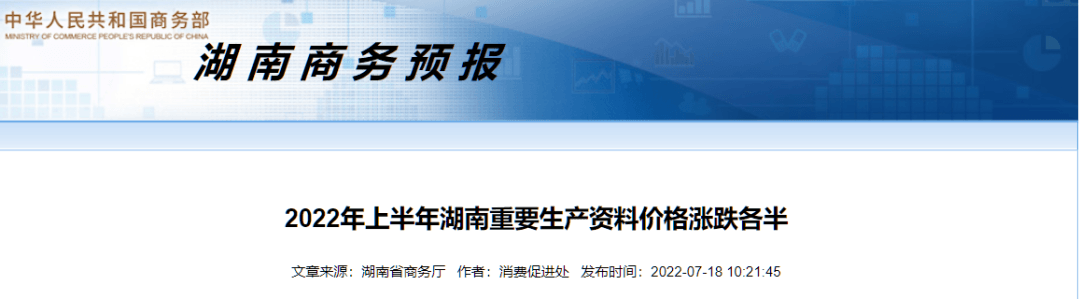 據湖南省商務廳重要生產資料市場監測系統顯示,2022年上半年全省重要生產資料價格環比漲跌各半。六大類商品中煤炭、成品油、化肥市場價格上漲;鋼材、有色金屬、水泥市場價格下跌。具體監測情況分析如下: