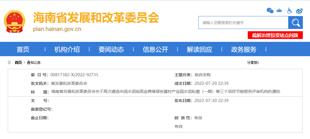 日前,海南省發改委發布《關于再次遴選華潤水泥臨高金牌港綠色建材產業園水泥粉磨(一期)等三個項目節能報告評審機構的通知》稱,根據《海南省固定資產投資項目節能審查實施辦法》(瓊府〔2017〕47號)等有關規定,我委擬公開遴選1家評審機構承擔華潤水泥臨高金牌港綠色建材產業園水泥粉磨(一期)等三個項目節能報告評審工作。