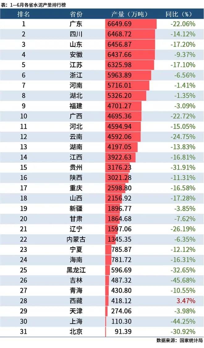 從分省數(shù)據(jù)來(lái)看,2022年上半年9個(gè)省市水泥產(chǎn)量同比降幅超20%。其中吉林降45.68%,上海降44.25%、黑龍江降32.65%、貴州降31.91%,北京降30.92%、遼寧降26.19%、云南降24.75%、廣西降22.72%,廣東降22.06%。具體情況如下: