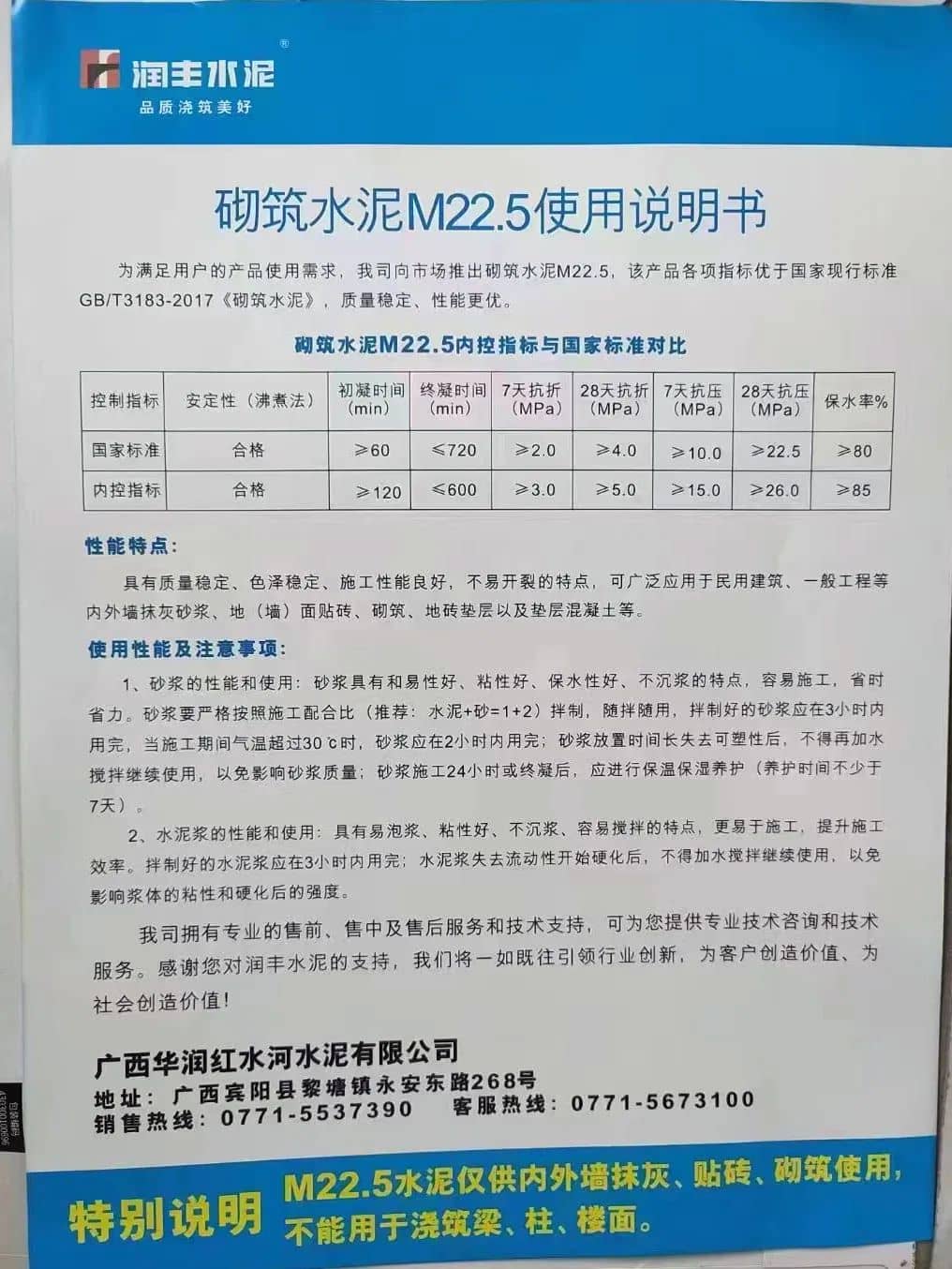 產品使用說明書中提到,為滿足用戶的產品使用需求,公司向市場推出砌筑水泥M22.5,該產品各項指標優于國家現行標準 GB/T3183-2017《砌筑水泥》,質量穩定、性能更優。并特別說明不能用于澆筑梁、柱、樓面。 M22.5水泥僅供內外墻抹灰、貼磚、砌筑使用,