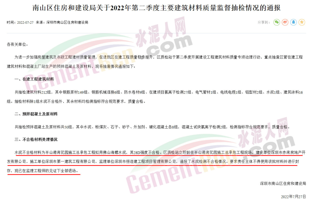 水泥不合格材料為半山港灣花園施工總承包工程擬用佛山海螺水泥,其28D強度不合格。區質檢站立即前往半山港灣花園施工總承包工程現場,建設單位深圳市赤灣房地產開發有限公司,施工單位深圳市第一建筑工程有限公司,監理單位深圳市恒浩建工程項目管理有限公司,通報了水泥檢測不合格情況。要求責任主體不得使用該批材料并進行封存,現已在監理工程師的見證下全部退場。