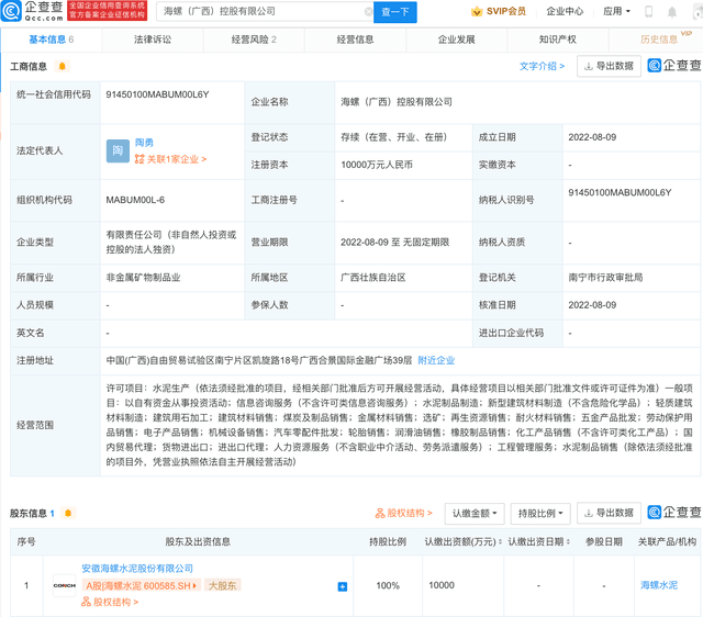 企查查APP顯示,8月9日,海螺(廣西)控股有限公司成立,法定代表人為陶勇,注冊資本1億元人民幣,經營范圍包含:水泥制品制造;新型建筑材料制造(不含危險化學品);輕質建筑材料制造;煤炭及制品銷售等。企查查股權穿透顯示,該公司由海螺水泥100%控股。
