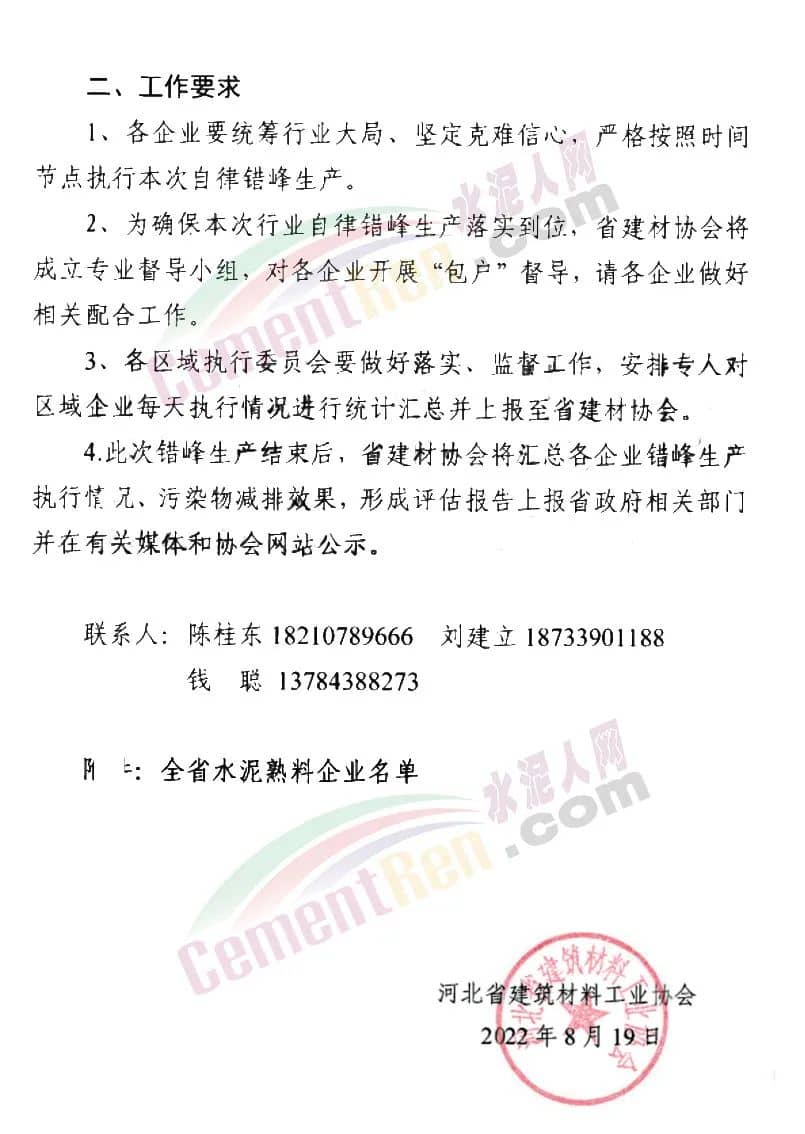 企業開展穩增長促發展行業自律錯峰生產的通知》,是覅有河北全省水泥熟料企業自2022年8月25日~9月13日,錯峰停窯20天。