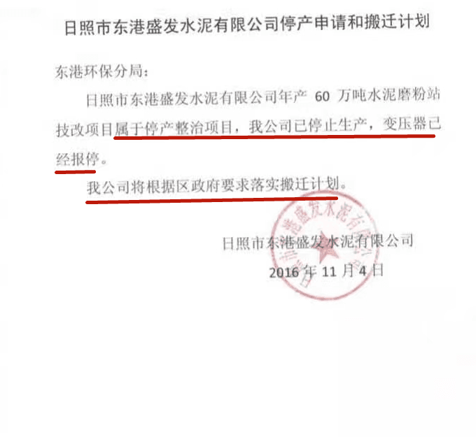 倒推時間軸,政府文件為證,2016年11月2號日照市東港區(qū)政府責(zé)令盛發(fā)停止生產(chǎn)的通知,11月4號企業(yè)上報區(qū)環(huán)保分局,明確:我公司將根據(jù)區(qū)政府要求落實搬遷計劃。