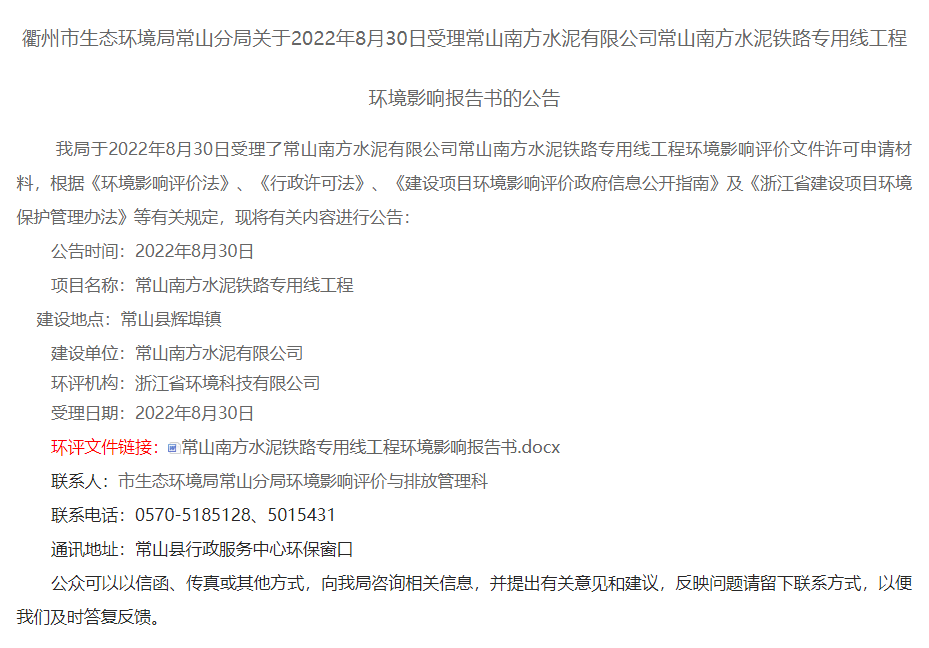 浙江省衢州市生態環境局常山分局發布《關于2022年8月30日受理常山南方水泥有限公司常山南方水泥鐵路專用線工程環境影響報告書的公告》