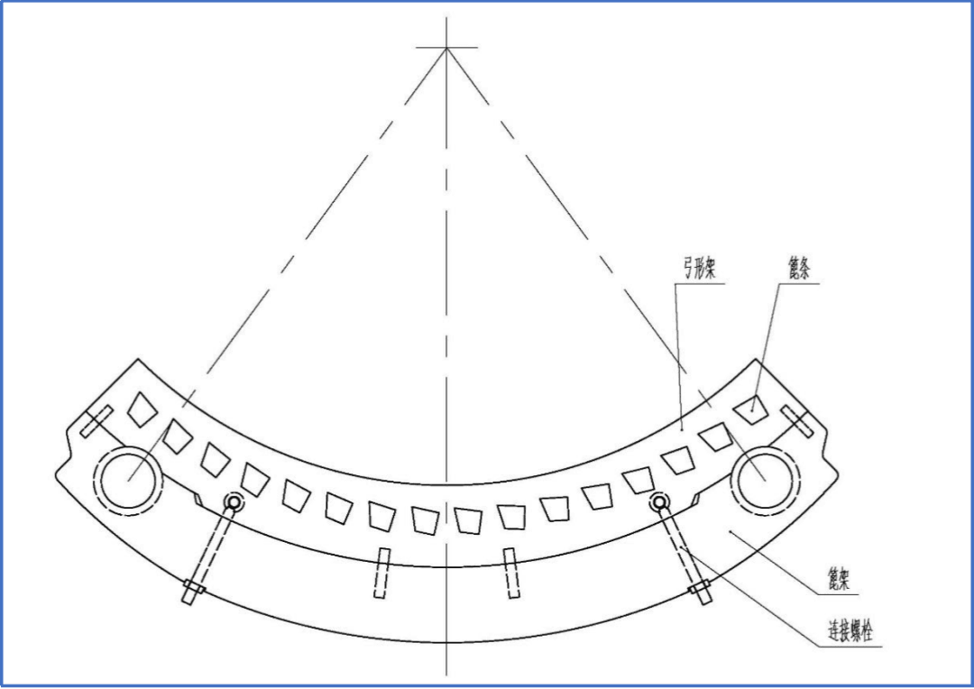如圖1所示,篦架上部分由弓形架、篦條、連接螺栓等部分組成。其中弓形架為t=30mm的鋼板下料而成。弓形架的外圓與篦架的內(nèi)圓相配合、定位,再通過連接螺栓固定弓形架。弓形架側(cè)面有梯形孔,通長(zhǎng)的鍛件篦條從四片弓形架的梯形孔中穿過,端面再以鋼板焊接形式封堵。