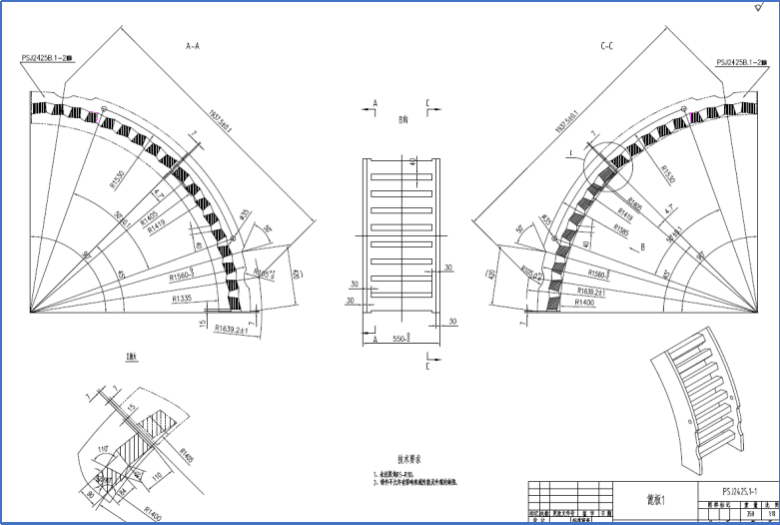 1.因弓形板與篦條改為整體鑄件形式,篦條的截面與弓形板的厚度需要重新調(diào)整,篦條的截面形狀為倒梯形,尺寸在原有基礎(chǔ)上適當(dāng)增大。每?jī)蓧K篦板間的連接板原為t=30mm的鋼板,修改后每?jī)蓧K篦板間的厚度增加了一倍,如尺寸保持不動(dòng)的話,破碎機(jī)轉(zhuǎn)子的錘頭與兩篦板的接口位置干涉,需要降低每?jī)蓧K篦板間的側(cè)板高度,與篦條保持同一高度,修改設(shè)計(jì)后的圖紙請(qǐng)見圖3。