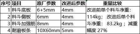 針對以上情況,建平華凱更換料斗材質,采用NM450 鋼板,徹底解決了磨損快、易變形等問題,在保證使用性能和壽命的同時,實現輕量化,降低運行負荷,同時提高了鏈條壽命。改造后料斗的壽命是原來的 2-3 倍,料斗減重 27%以上,提升機運行電流會有所降低,經廠家實測,理論計算在6%左右。
