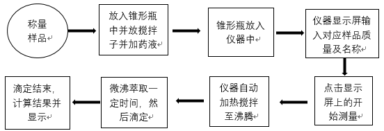 稱量一定量的樣品,將其倒入150ml錐形瓶中,加上30ml的乙二醇-無水乙醇溶液,放入攪拌子,然后放入儀器中對應(yīng)位置,裝上冷凝管,使得錐形瓶與冷凝管緊密連接,在儀器顯示屏對應(yīng)的位置輸入稱取的樣品質(zhì)量及樣品名稱,點(diǎn)擊開始測量,儀器會自動進(jìn)行攪拌、加熱、萃取、滴定及結(jié)果計算,如圖2。