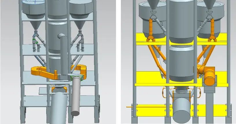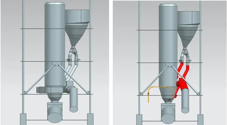 1)三次風管雙進風系統阻力大、能耗高,分支管道因彎頭及長度造成阻力不均勻,不易調節三次風閥進行控制,很難確保分支管道入爐場氣流的均衡穩定,導致爐場氣流與物煤料混合絮亂,對分解爐錐部煙室的風阻和氣料干擾大;雙進風設計彎頭角度大,易造成管道積料和磨損,日常檢修、維護成本高。