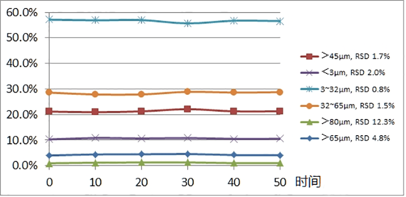 長時間連續(xù)的工作,對在線系統(tǒng)的防污染及自清潔能力提出了很高的要求,歐美克在線系統(tǒng)通過風刀反向增壓紊流自動清洗技術顯著延長了系統(tǒng)的免人工維護時間。相較于傳統(tǒng)順序壓力梯度清洗方式,歐美克在線系統(tǒng)的窗口自潔能力得到了極大地提高,顯著地降低了人工手動清洗測試窗口的頻度,同時保障了測試結(jié)果始終可靠!以某品牌的PO42.5水泥樣品為例,在風刀自動清洗維護下,系統(tǒng)無人干預連續(xù)工作3個月以上,45um余量、3-32um含量、32-65um含量、小于3um含量皆能保持良好的重現(xiàn)性,且無趨勢性偏移。在此案例中,無人干預連續(xù)工作超過3個月,以上含量連續(xù)監(jiān)控相對標準偏差均在2%以內(nèi)。