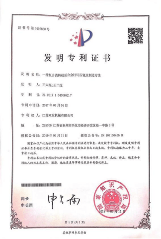鑄釘合金輥套發(fā)明專(zhuān)利證書(shū):