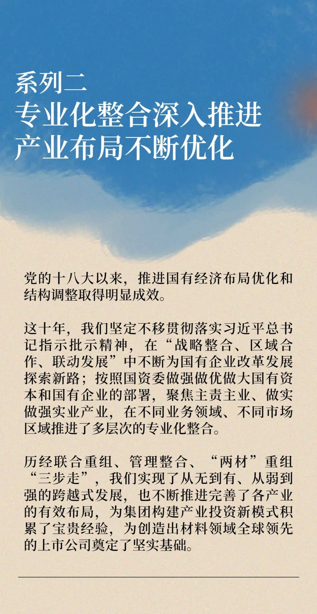 下一步,我們將聚焦主業、做強實業,有序推進尚未完成的專業化整合項目,繼續深化已整合企業的深度融合、釋放重組協同效益,進一步提升核心競爭力,為建設具有全球競爭力的世界一流材料產業投資集團貢獻更大力量,進而在夯實大國經濟根基、服務構建新發展格局中發揮更大作用。