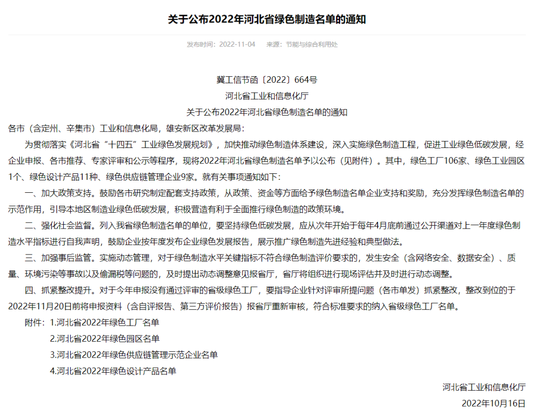 2022年河北省綠色供應鏈管理企業名單中包含贊皇金隅水泥有限公司、唐山冀東水泥三友有限公司、唐山冀東水泥股份有限公司唐山分公司、曲陽金隅水泥有限公司、保定太行和益環保科技有限公司等5家水泥企業。
