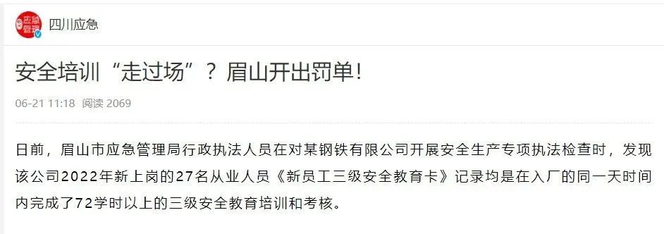 四川眉山市應急管理局開展安全生產專項執法檢查時,發現某公司2022年新上崗的27名從業人員《新員工三級安全教育卡》記錄均是在入廠的同一天時間內完成了72學時以上的三級安全教育培訓和考核。