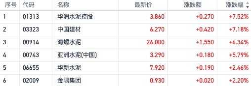 水泥股早盤普漲,截止下午14時,華潤水泥控股,中國建材漲超7%、海螺水泥漲超6%,華新水泥、金隅水泥跟漲。