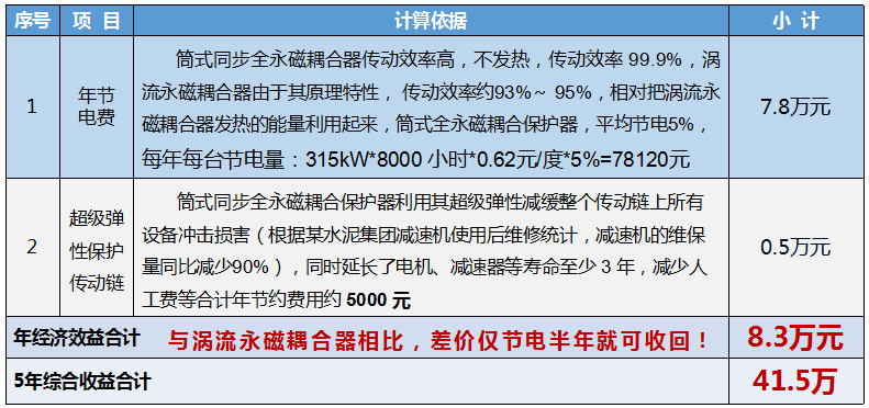 除上述性能優(yōu)勢(shì)外,江蘇磁谷同步永磁耦合器的應(yīng)用還能大大節(jié)約水泥企業(yè)生產(chǎn)成本,以原使用渦流永磁耦合器對(duì)比估算,按1臺(tái)套平均功率315kW,每年工作8000小時(shí)進(jìn)行測(cè)算,應(yīng)用江蘇磁谷同步永磁耦合器后預(yù)計(jì)每年可節(jié)約8.3萬(wàn)元,產(chǎn)生的經(jīng)濟(jì)效益十分可觀。