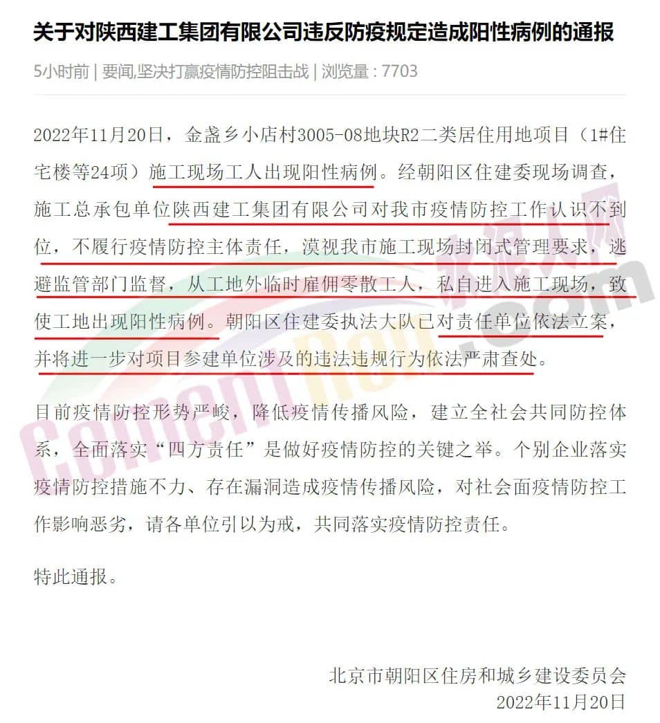 11月20日,據(jù)北京市朝陽(yáng)區(qū)住建委通報(bào),2022年11月20日,金盞鄉(xiāng)小店村3005-08地塊R2二類(lèi)居住用地項(xiàng)目(1#住宅樓等24項(xiàng))施工現(xiàn)場(chǎng)工人出現(xiàn)陽(yáng)性病例。經(jīng)朝陽(yáng)區(qū)住建委現(xiàn)場(chǎng)調(diào)查,施工總承包單位陜西建工集團(tuán)有限公司對(duì)北京市疫情防控工作認(rèn)識(shí)不到位,不履行疫情防控主體責(zé)任,漠視北京市施工現(xiàn)場(chǎng)封閉式管理要求,逃避監(jiān)管部門(mén)監(jiān)督,從工地外臨時(shí)雇傭零散工人,私自進(jìn)入施工現(xiàn)場(chǎng),致使工地出現(xiàn)陽(yáng)性病例。朝陽(yáng)區(qū)住建委執(zhí)法大隊(duì)已對(duì)責(zé)任單位依法立案,并將進(jìn)一步對(duì)項(xiàng)目參建單位涉及的違法違規(guī)行為依法嚴(yán)肅查處。