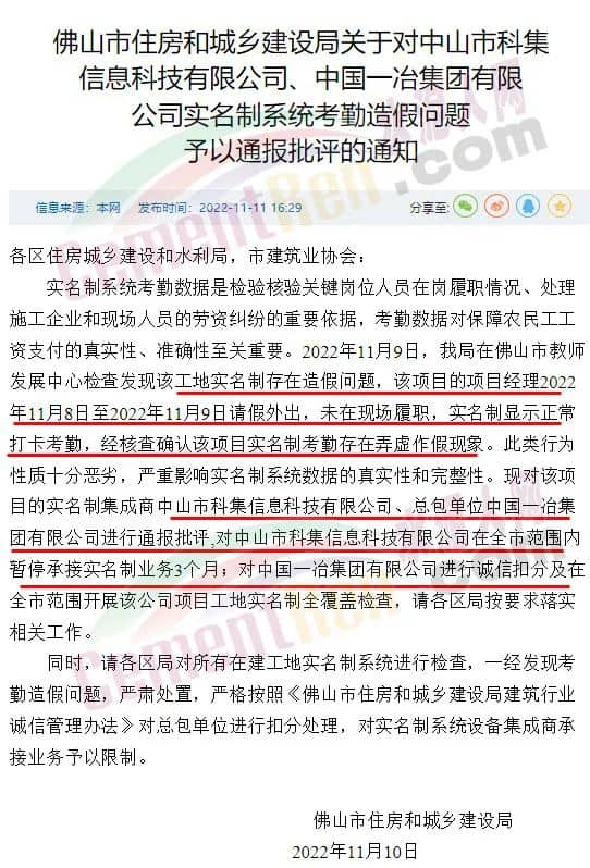 因此,對(duì)中山市科集信息科技有限公司、總包單位中國(guó)一冶集團(tuán)有限公司進(jìn)行通報(bào)批評(píng)。對(duì)中山市科集信息科技有限公司在全市范圍內(nèi)暫停承接實(shí)名制業(yè)務(wù)3個(gè)月;對(duì)中國(guó)一冶集團(tuán)有限公司進(jìn)行誠(chéng)信扣分及在全市范圍開(kāi)展該公司項(xiàng)目工地實(shí)名制全覆蓋檢查。