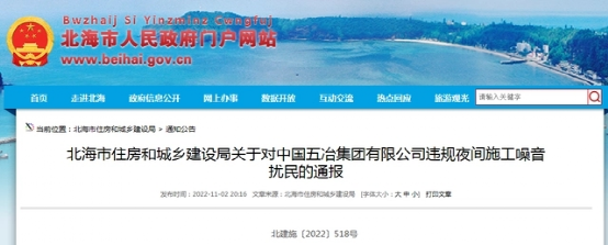 廣西北海市住建局通報(bào)中國(guó)五冶集團(tuán)有限公司違規(guī)夜間施工噪音擾民