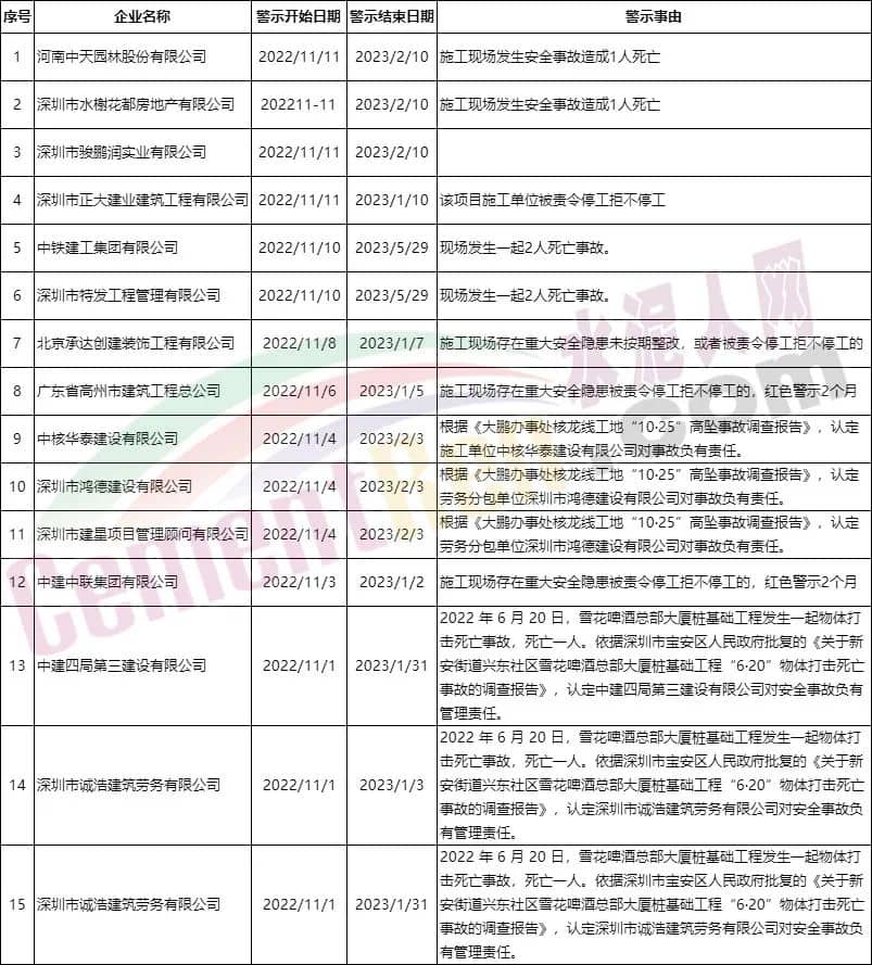 據(jù)查詢(xún),11月1日至今,深圳市住建部門(mén)通報(bào)實(shí)施紅色警示的企業(yè)共有包括中鐵建、中建中聯(lián)、中建四局等建筑企業(yè)在內(nèi)的15家企業(yè),警示結(jié)束日期為2023年1月~5月。