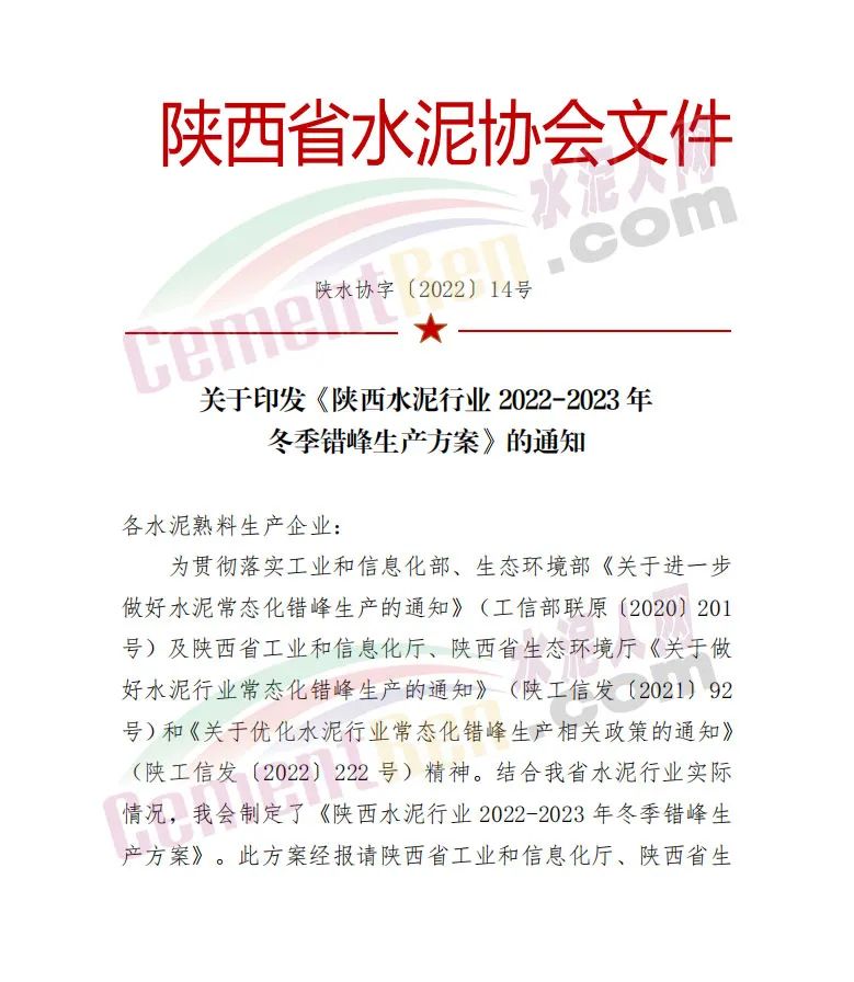 日前,陜西省水泥協(xié)會(huì)發(fā)布關(guān)于印發(fā)《陜西水泥行業(yè)2022-2023年冬季錯(cuò)峰生產(chǎn)方案》的通知,要求全省所有水泥熟料生產(chǎn)線2022年12月1日0 時(shí)-2023年3月10日24時(shí),期間錯(cuò)峰停產(chǎn)100天。